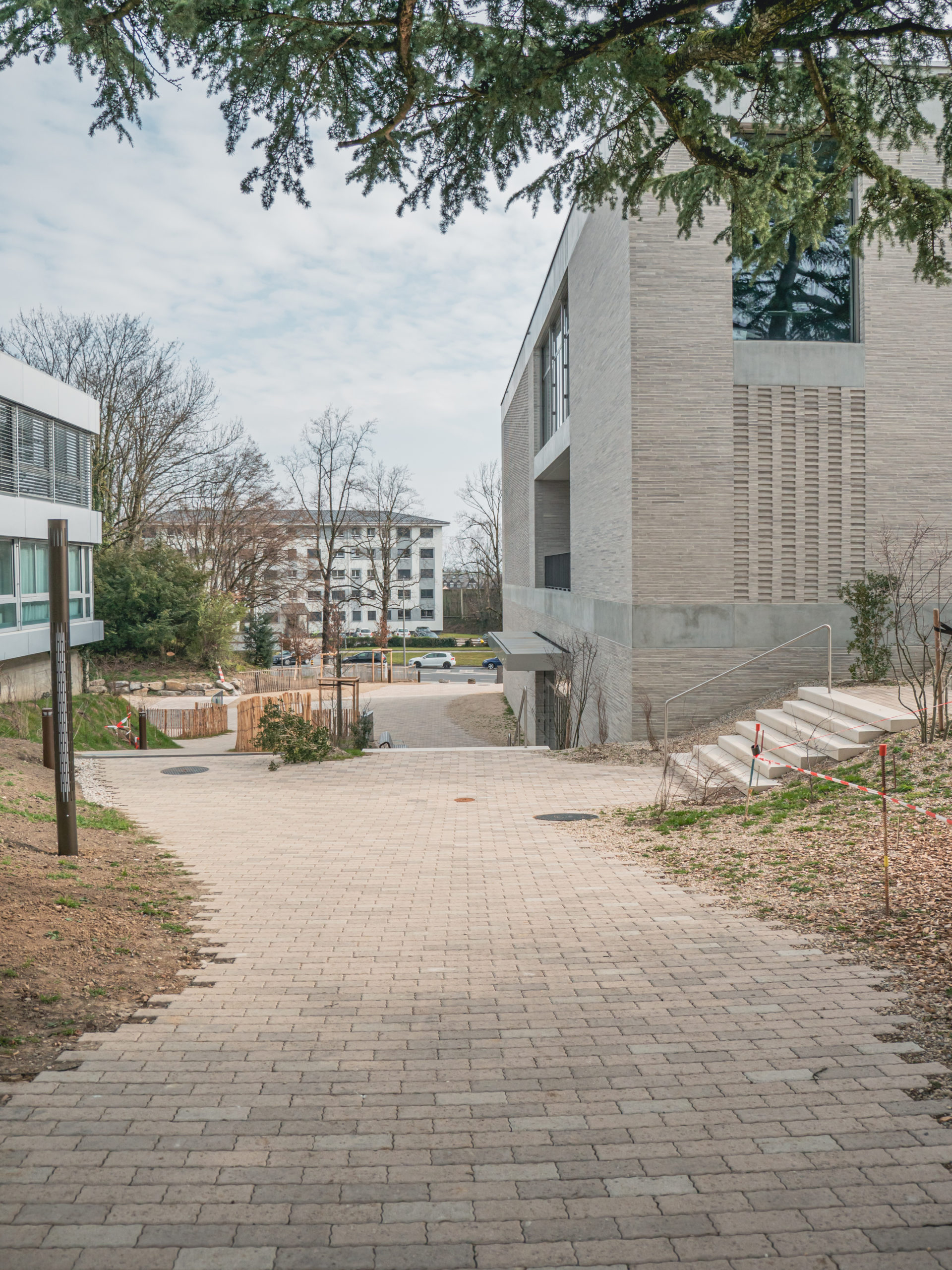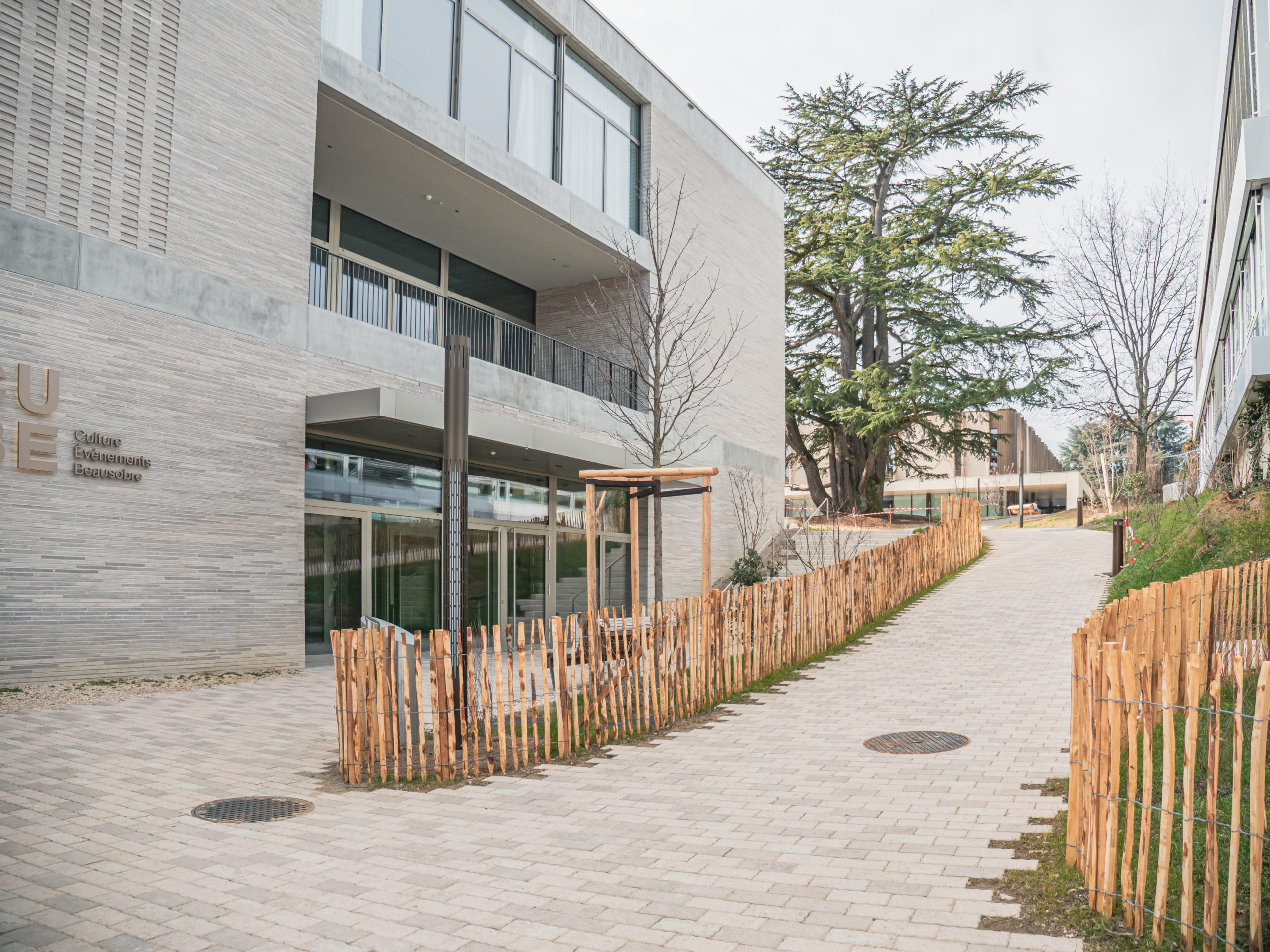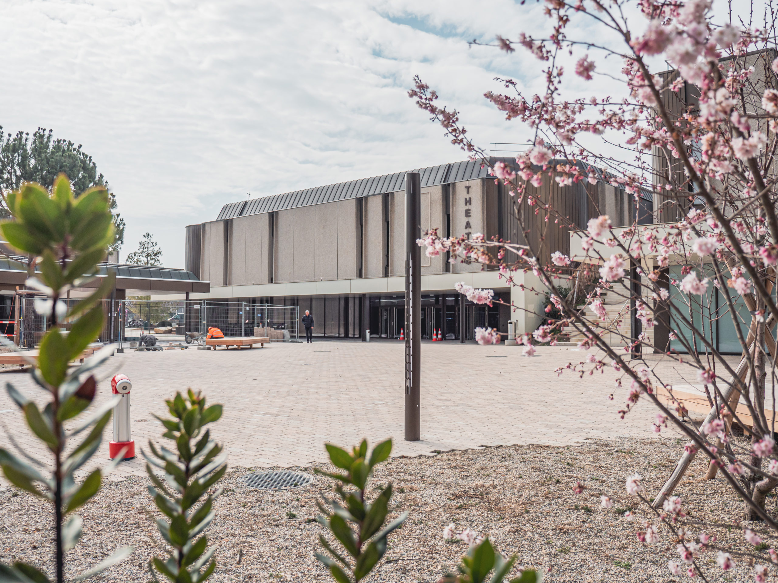 Transformation complète des abords du théâtre de Beausobre à Morges, avec des surfaces en pavés béton, des escaliers, des réseaux complexes et des interventions en milieu urbain fréquenté.