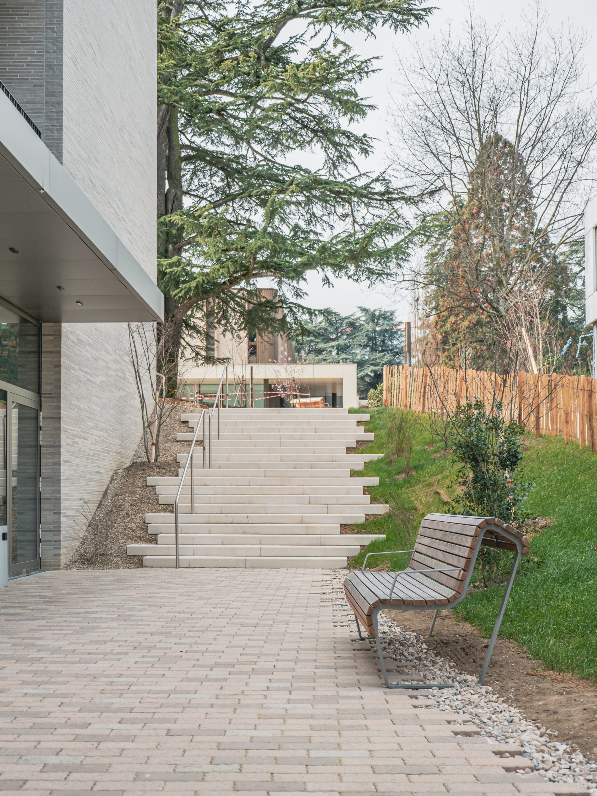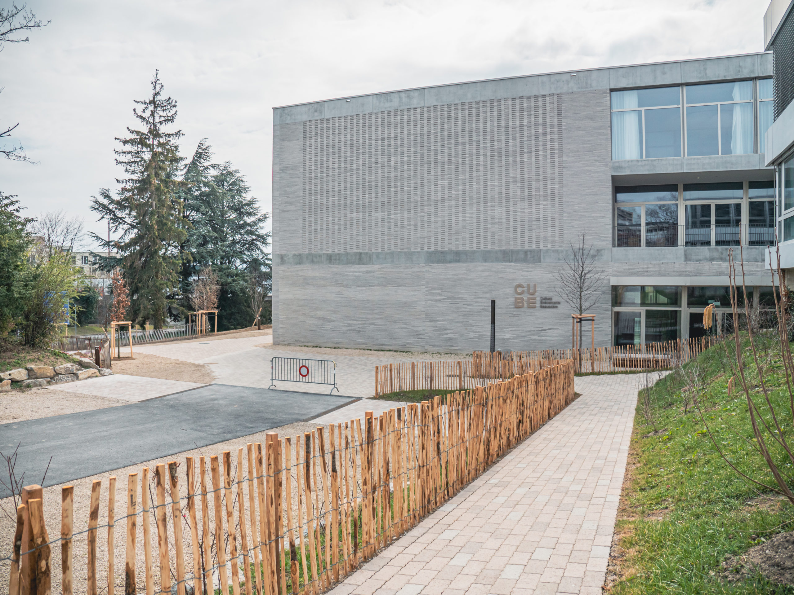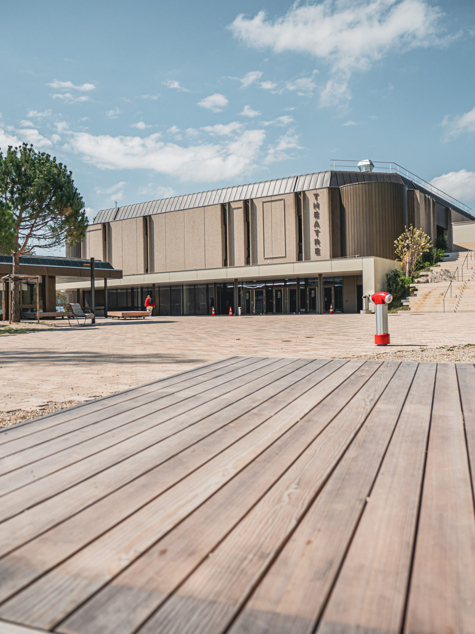 Transformation complète des abords du théâtre de Beausobre à Morges, avec des surfaces en pavés béton, des escaliers, des réseaux complexes et des interventions en milieu urbain fréquenté.
